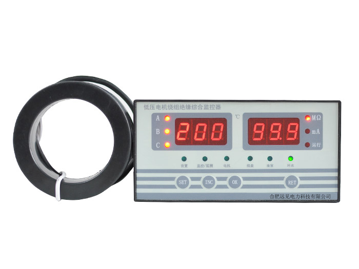 YJ-DJK-I型低压电机绕组绝缘综合监控器(以下简称监控器)是一种专用于监测电机在运行过程中的温升、进水及绝缘的仪器,适用于低压潜水电机(干式电机),以确保设备的正常运行。控制器采用单片机设计,除了有较强的功能外,对潜水电泵运行的特殊情况采取了一系列抗干扰措施,以保证监控器运行稳定可靠,传感器输入端具有强抗电压冲击能力,适用(AC220V、AC380V、AC660V)各种电泵作为保护器配用。控制器对低压电机的绕组在停机情况下,对地施加连续DC500V电压,测量其绝缘状况。